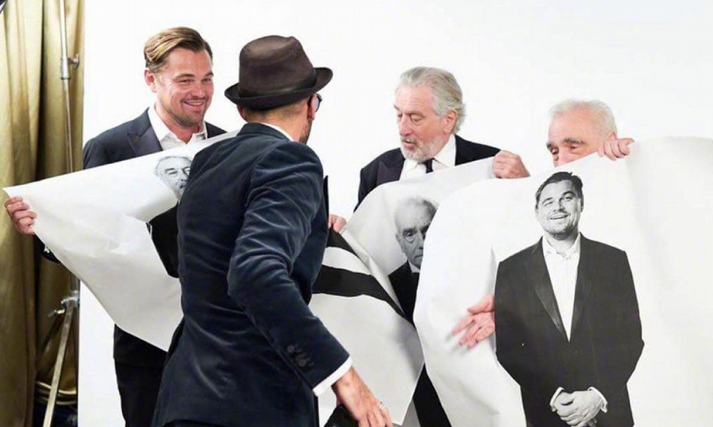 JR指揮李奧納多.狄卡皮歐(Leonardo DiCaprio,左)、勞勃.狄尼洛(Robert De Niro,中)以及馬丁.史柯西斯(Martin Scorsese,右)拍攝合照。(© JR)