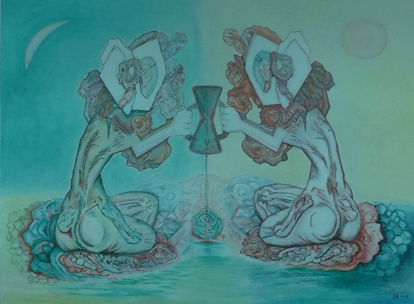 如此,我手畫我心,忠於自我且用力追求生命的女人就是賴美華。1975年的《花魂》,花的種子何時萌芽?何時會綻放?唯有等待。2008年的《我與我》,兩個賴美華,一個白晝,一個黑夜;一個現實生活中的女人,一個堅持創作的畫家,爭搶一個時間之杯,時間終究有限,時間之杯流淌而下的創作之血,沉與浮,無休無止。