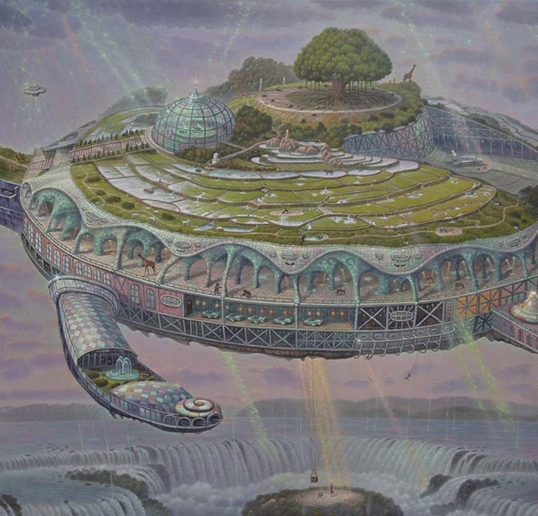 「全景劇場」是連建興現階段最醒目的創作語彙,從此前的「陸」、「海」發展而來,最為代表性的畫面主題,當屬懸浮於半「空」、常以島嶼、鯨、烏龜等形象為載體的生態方舟。連建興總是同時、並長時間進行多幅作品的創作,無異於為不同時期屬於形而上的精神世界,製造出宛若平行時空的多重分身。其中新作《烏龜島幸福方舟》與此前此類作品的最大不同,乃是以工業科幻為主基調,更為明確地將視野朝向某種未來性;而自然與人為科技接合而成巨大的龜身有機體,有關「萬物齊一」的審美精神呼之欲出。相較於1998年的作品《怪怪飛行方舟》中曾以方舟居民的視角眺向艙外,二十餘年後的《烏龜島幸福方舟》及其透露出的審美典型,則代表著連建興在此前創作經驗不斷累積過程中,變換視角而逐漸體悟到對於鄉土記憶的反芻與憑吊,終將歸於一種全局式的生態關懷與想望,「方舟」所意味著的航線方向,則是一再復返的那個寧靜而和諧的精神原鄉。