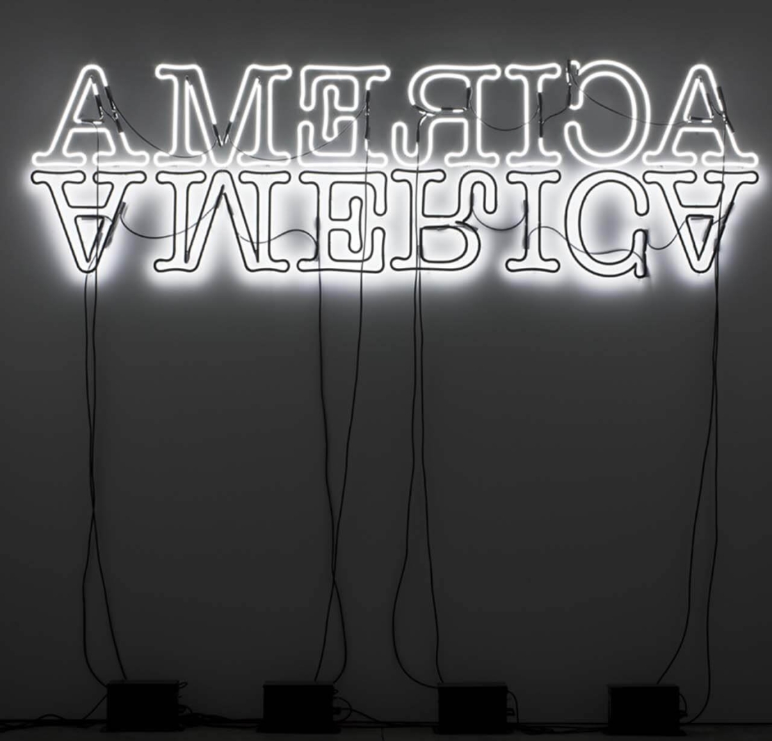 延續其對語言、文本和文化符號的嫻熟與遊戲,《雙重美國》將「America」一字相對呈現,一個正立在頂部,另一個倒立在底部。在這一系列以「America」為文的霓虹作品中,霓虹燈管以不同方式照亮「America」這個字,包括熄滅、閃爍或將某些字母顛倒。對里根而言,它們呈現的,正是關於「美國」這一觀念的複雜和變化性。兩個不同的「美國」可能代表著不同版本的美國生活,既充滿自由與民主的光亮,但在亮度被黑漆阻擋下,又暗示了某種籠罩、困擾著美國社會的陰影及其與世界的關係。