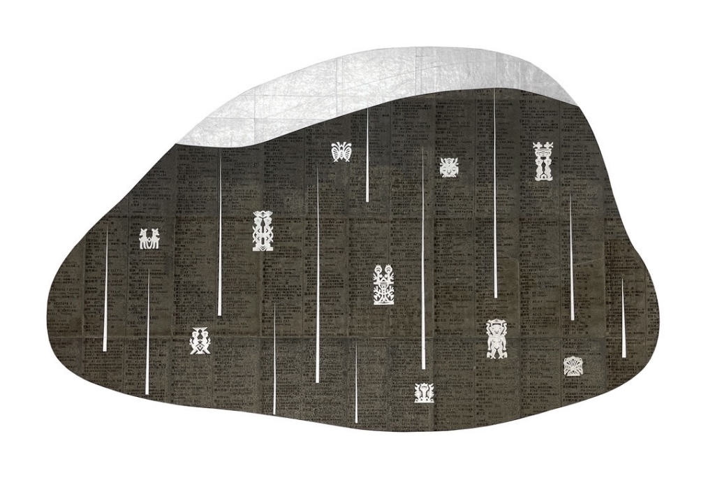 舊時的文字,是以那個時代的慣用文法排列而成,它成為了迴盪在作品平面中的環境音,在其之間的圖像與線條則像是詩一般地排列著,與紙頁空白處與文字處之間的空間性產生交響。在新作中,吳耿禎挑戰了更細緻的墨與銀箔等材料,基底層紙材中的文字如同身披著薄紗般的墨,並貼上映射環境中的光的薄銀箔。由剪紙技術而生的對稱性圖騰,成為了在黑暗中反光的剪影,又像是通往另一空間的窗孔。箔既是紙,又是金屬,置於墨紙中所產生的異質性,通透了構圖中的視覺空間。它們彼此之間的空間性關係,令我聯想到某些讓些微的自然光取代室內人造光、會令人意識到自然環境也參與在結構之中的當代建築。