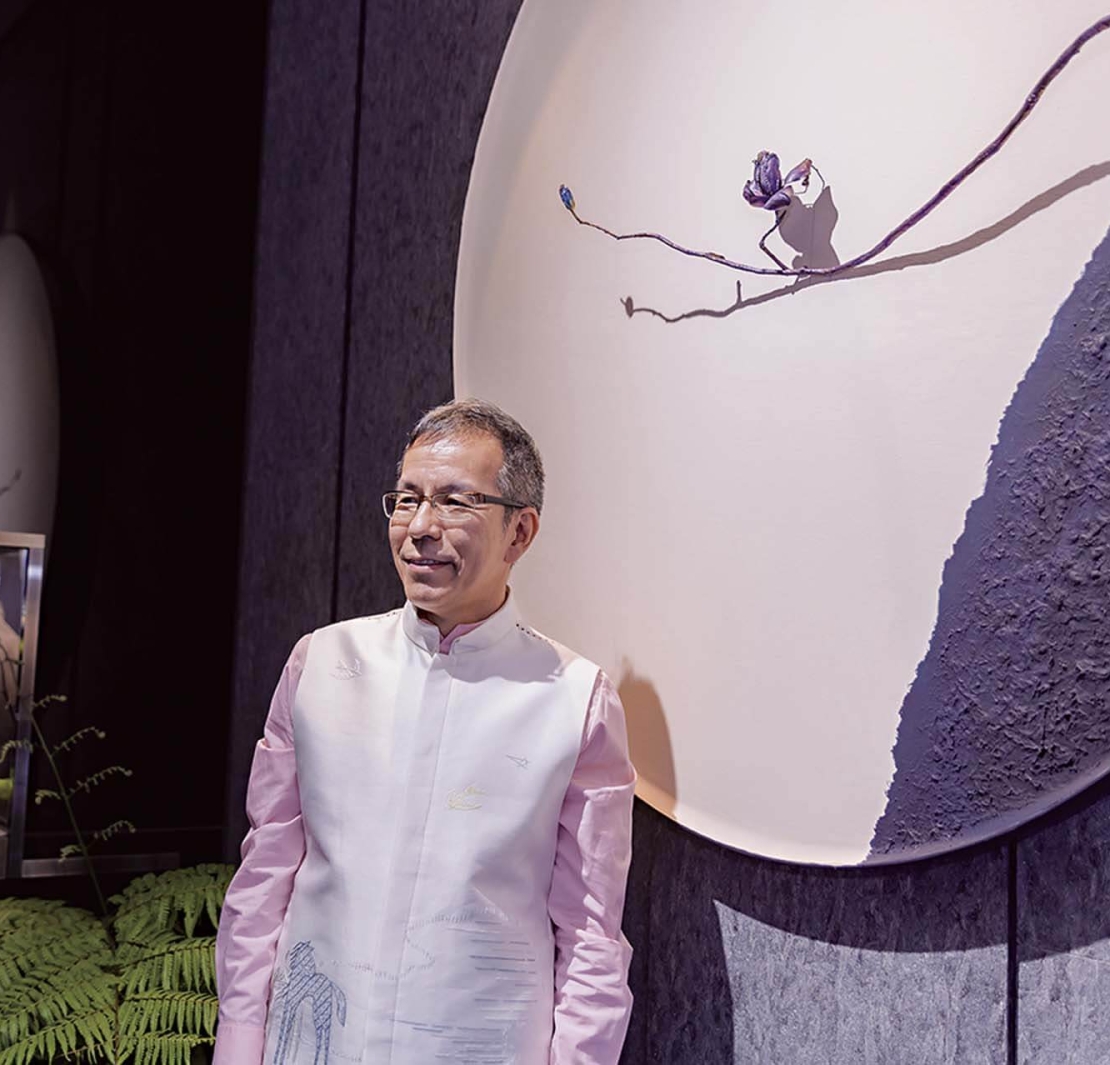 自幼篤信佛教的陳智權,對空性本心有深刻的參悟。長年浸潤於書法、花藝、茶道等東方文化氛圍下,他對於從茶禪文化提煉出的極簡美感有深厚理解。無論是日本茶聖千利休(1522-1591)所追求的「侘寂」之美,或是宋代名窯優靜謐簡潔的風韻,皆被他巧妙轉化於創作中。孕育自然天地的「四元素」系列《水、地、風、火》,以及代表四季變化時序的「四季」系列《春、夏、秋、冬》作品,運用東方園林造景的框景手法,在仿宋窯瓷盤的留白背景上,以珠寶點綴一花、一果、一鳥,詩意而虛懸的構圖,恍如南宋宮廷畫家筆下的「小景」花鳥畫,散發著枯木逢春的生命力。