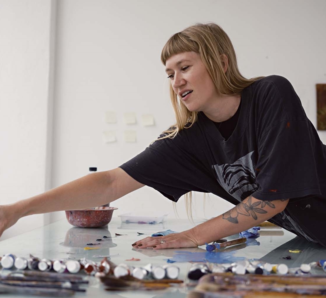 紐西蘭出生的麥金泰爾自幼便對繪畫懷抱熱情,這份熱情最終引領她踏上充滿探索與實驗的藝術之路。從奧克蘭的藝術學院到美國紐約、洛杉磯,她的創作歷程從早期對具象繪畫的學習,轉向以抽象繪畫為核心,逐步圍繞著繪畫的本質展開。在她的工作室裡,顏料與材質交錯變化,傳統的油彩與氧化鐵、氣泡布、萵苣等非典型材料相互滲透,賦予畫作超越時空的生命力與豐富的肌理。她的筆觸時而自由奔放,時而精準收束,在偶然與控制之間取得微妙的平衡。對她而言,繪畫並非靜態的視覺呈現,而是一場充滿變數的鍊金術實驗,透過顏料的堆疊、氧化與時間的推移,讓畫面持續轉化,不斷生成新的意義。如今,定居洛杉磯的她,延續著這場關於材質與時間的對話,即將於2025年3月在香港卓納畫廊(David Zwirner)舉辦她的首次亞洲個展「天鵝之擁」 (Among my swan),展現近年來的最新創作,延續她對繪畫的探索和實驗。