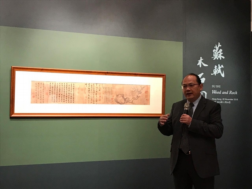 11月10日,佳士得中國書畫部國際資深專家游世勳,於佳士得香港 2018年秋季拍賣台北預展導覽解說蘇軾〈木石圖〉。