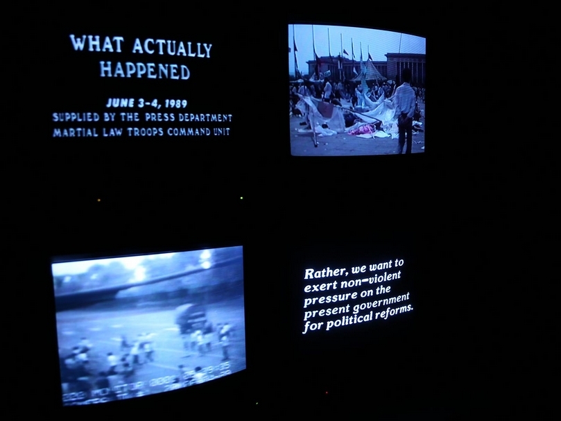 ARTouch:1989年您帶著陳凱歌給您的一台小型攝影機一個人去了北京,親歷了「六四天安門事件」(以下簡稱「六四」),並用當時拍下的第一手影像,結合電視媒體的報導完成了兩件作品、也在今年的TIDF展出:五頻道的錄像裝置《Making News Making History: Live From Tiananmen Square》和與王俊傑合作的《歷史如何成為傷口》。想請您大致談一下這段經歷。是什麼驅使您去到那樣一個現場?為何最終決定做成五頻道的錄像裝置?以及,如何做出將文字也作為單獨的頻道這樣一種特別的部署?