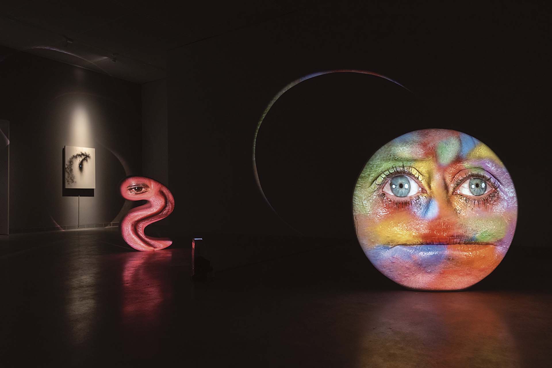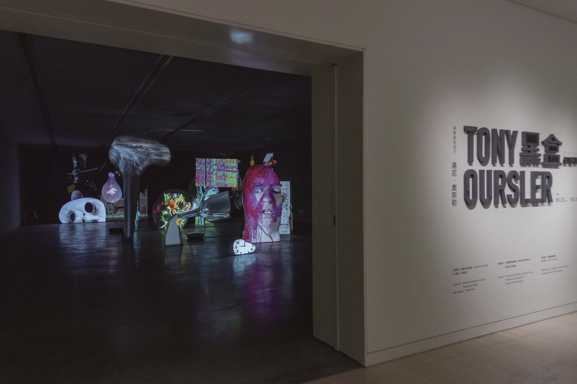 美國錄像藝術先鋒湯尼.奧斯勒(Tony Oursler)此次於高雄市立美術館展出的「黑盒:幻魅於形」是其於亞洲首度最完整的回顧展。為此,奧斯勒本人也特別來台隔離,參與開幕及座談,本刊則專訪了藝術家,邀請奧斯勒與我們分享其對創作的思考。然而,欣賞奧斯勒的作品,或許最好的方式就是將自己當成即將踏上異世界旅行的愛麗絲。你可以盡情地去探索藝術家為你打造的奇異世界,而那些在煙霧裡呢喃低語、隨風飄散的人物影像,便成為了歷險過程裡,伴隨你和提醒你的精靈仙子或神諭,於是你可以接受那些只有大眼睛一眨一眨的電子影像生物,或者是在有機造型上那扭曲又充滿詭局幽默感的嘴部表情⋯⋯。在這些異於日常的臉孔、眼睛和嘴巴影像中,藝術家透過整合魔術、劇場表演以及電子時代的視覺技術,在作品的裝置空間裡打造出一個全新的科技生命情境。