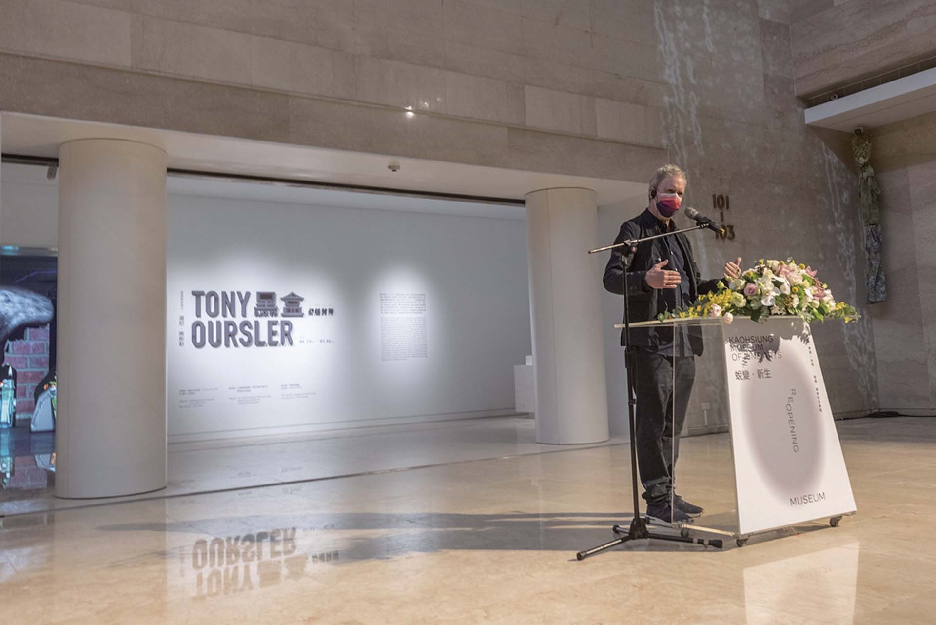 湯尼.奧斯勒(以下簡稱奧斯勒):很高興這次能在台灣舉辦展覽,幾年前第一次見到玉玲館長時,我們就開始討論展覽的可能性,也因此我們花了兩、三年的時間來一起選擇作品,並在一年前左右,特地來參訪高美館的空間。由於「裝置」是我一直以來的創作形式,換言之我會非常仔細地考慮作品的位置,因此參訪空間對我很有幫助。此外,我密切地與玉玲館長及策展人柯念璞討論要如何在這最近才剛翻新的美術館美麗建築空間中一起合作。我們希望當觀眾來到美術館時,他們會發現建築自身和藝術之間存在一種非常獨特的關係。我並不想在此透露太多,但保證觀者將會得到一定程度的驚喜。某些人物作品,會出現在一些超乎預期的地方。回到作品選擇這個問題上,作品選擇在時間軸上回溯至當我開始製作如今被稱為「錄像藝術」作品的1980年代。
