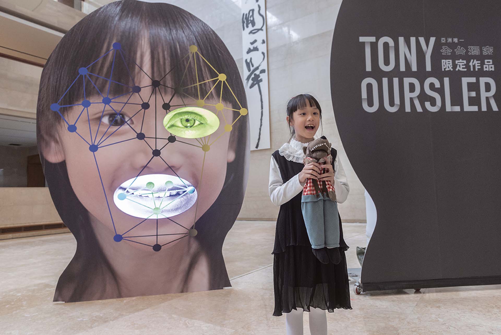 我們製作了三件大型有關臉部辨識的作品放在大廳,並且一如你所提及的其中一件是兒童的臉孔,孩子們很快地即將必須要去回應資訊時代,而我希望去激勵孩子們像思考藝術一般去思考科技。因此,美術館提出我可以和台灣的小朋友一起合作的想法,而他們設計了一個網路競賽,之後我們在作品中使用了所有參與者的影像,這一點令我十分開心。我期待孩子們走進展覽,並且仔細地看看自己然後拿起智慧型手機告訴我們可以用它來做些什麼。
