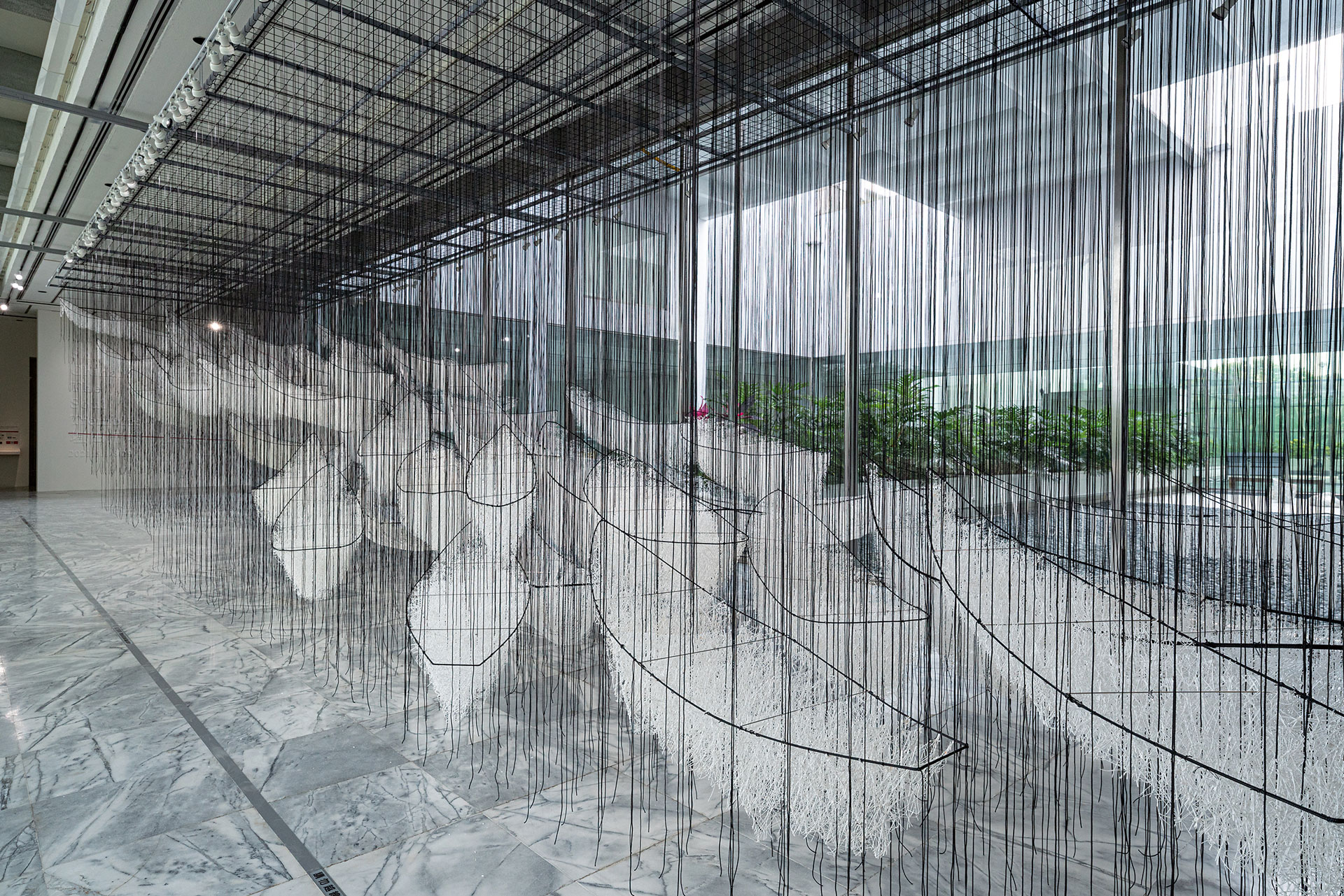 塩田: 我的每一件大型裝置都會根據空間來創作,進入空間後我才會開始思考如何編織,一開始它們當然是線條,常有人問我會編織到什麼程度?我會編織到人們看不出那是線的時候。當你的視覺無法理解那是線條的時候,它就會帶你到另一個宇宙,呈現給你另一個世界。