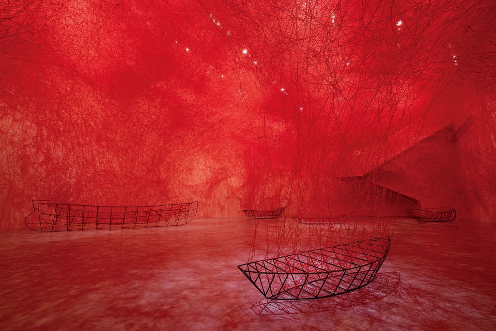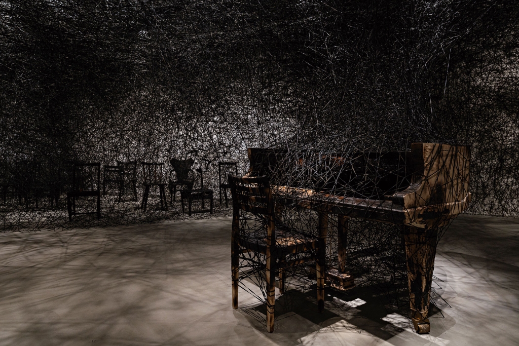 臺北市立美術館「塩田千春 : 顫動的靈魂」將兩年前於日本森美術館舉辦的塩田千春(Chiharu Shiota)生涯大展原味呈現,在全球疫情中,台灣成為這一由森美術館館長片岡真實(Mami Kataoka)策劃的巡迴展之首站。大型裝置、雕塑、行為錄像、攝影與素描及舞台設計相關圖稿共百餘件於焉展陳,無論是塩田千春膾炙人口的由密織線材為主體的空間裝置,還是難得展出的行為記錄、紀實影像、乃至與歐洲和日本多個劇團合作的舞台設計,一位藝術家傾其生命拓展而出的創作脈絡,在這次展覽中得到有張有弛、相當完整的鋪陳。生命與死亡,廢墟與希望,激進與精妙,以及更多交織著情感與哲思的脈動在其中傳遞著。藉藝術家及其團隊親臨台北完成現場作品及布展工作之際,本刊獲得此專訪機會,得以進一步了解其創作生涯的若干主軸與細節之處。