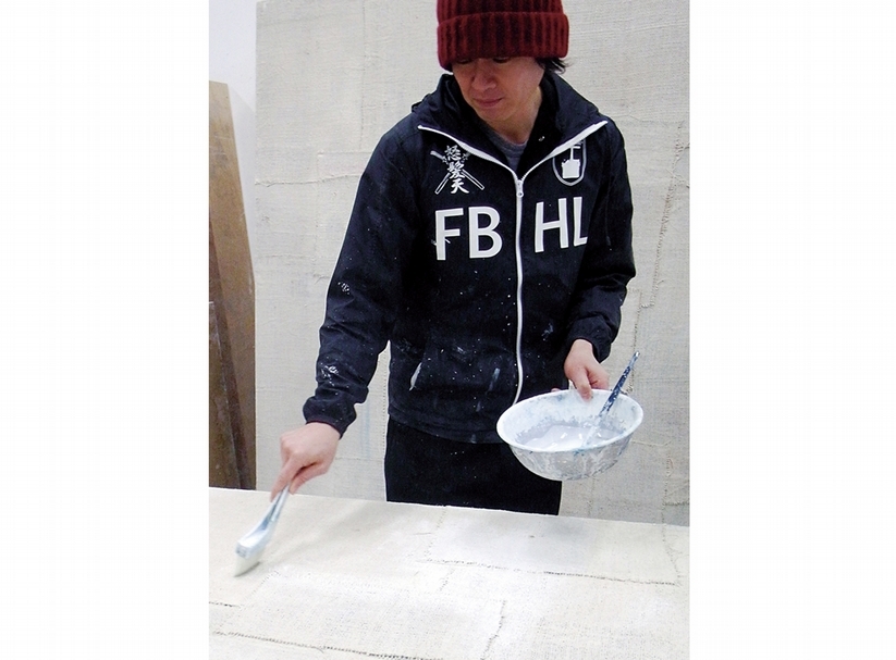 您的創作常就地取材,例如在信封、紙板上繪畫,2003 年您開始嘗試以木板做為畫布以外的繪畫載體,這次最新的作品更增加了覆蓋於木板之上的多層粗麻布,一開始如何有這樣的嘗試?