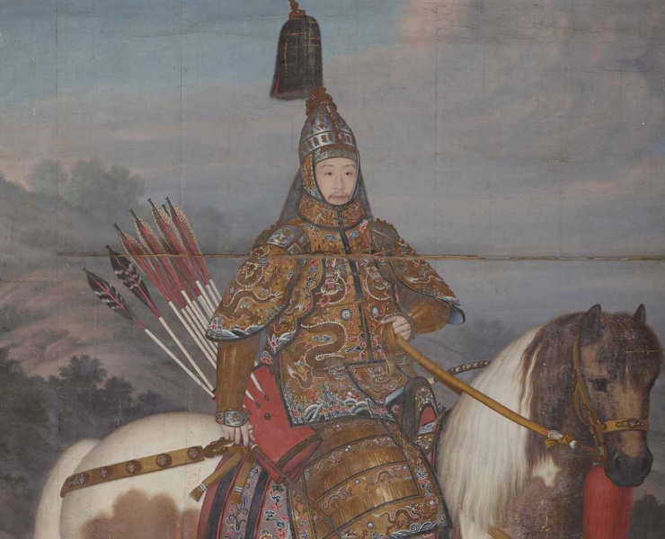 北京故宮博物院藏《清人油畫弘曆騎馬像軸》據考證是是乾隆4年弘曆親臨南苑狩獵場檢閱的樣貌,皇帝騎在馬背上,身穿華麗的盔甲,...