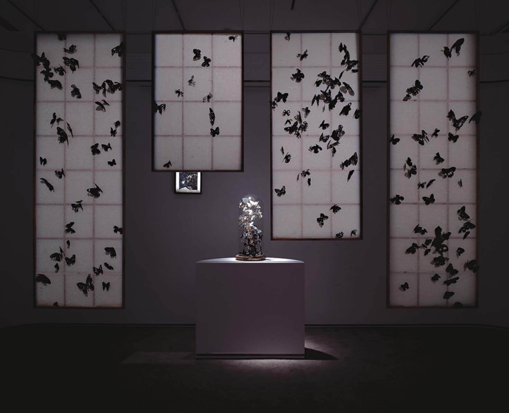翩綿蝶影輕落於輕薄透光的障子門上,宛若文學家落筆於稿紙上的斑斑墨彩。觀者輕柔地吐息時,蝴蝶也隨氣流振翅翻飛,似乎易碎飄零...