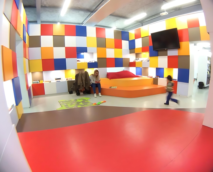 圖書館採用彩色條板裝飾在屋頂和二樓窗前,既柔和了夏季陽光直射,也暖化了冬季光照,更具文化與活力的識別度,它可是「共創空間...