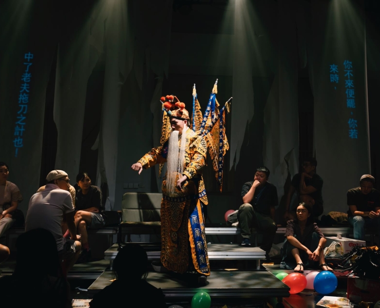 不同於過往於戲曲中心裡頭上演的新編、改良戲曲或跨劇種文本,傳統的戲曲形式,在這個難以區分舞台與觀眾席的方形表演空間裡可說...