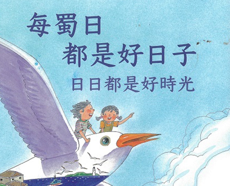 《每蜀日都是好日子(日日都是好時光)》的封面圖像,是乘著羽翼向上往前的探索,帶著期待與歡喜;書名頁的島嶼質樸豐盛,有花卉...