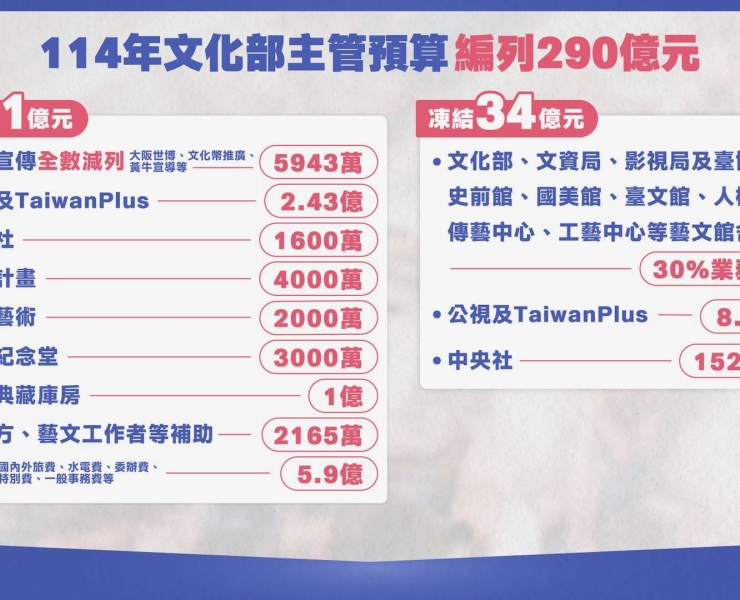 文化部114年主管預算原編列290億元,經初步計算共刪除11億元、凍結34億元。文化部指出刪除部分,除針對各機關國內外旅...