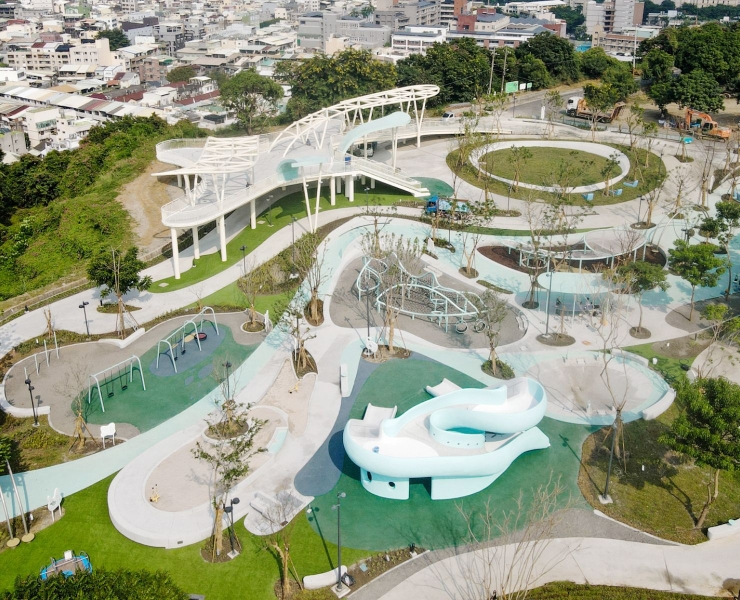 公園強調「共融」精神,設有無障礙路徑與多元尺度遊具,讓長者、孩童及行動不便者都能共享同一片遊戲天地。搭配原生植栽與自然遮...