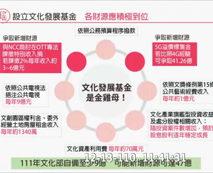 文化基本法三讀通過後,文化部擬依該法成立「文化發展基金」,以支持文化發展及公共媒體等事務,並避免相關經費受年度預算增減影...