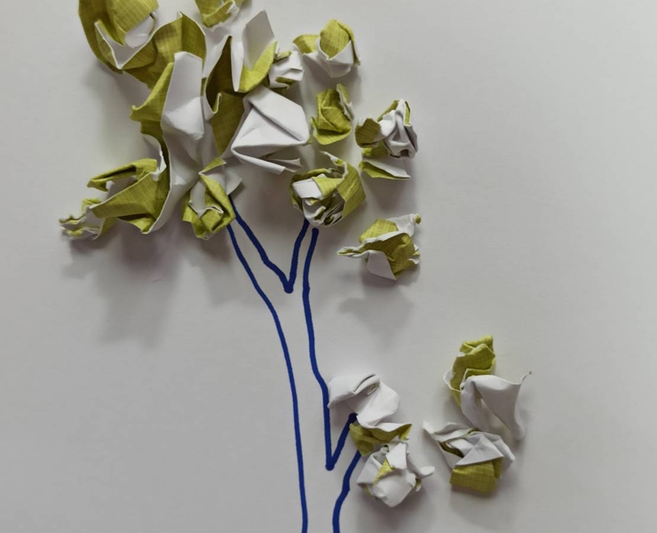 準備許多回收紙,讓小朋友們動手揉一揉再進行黏貼、學齡前的小朋友也可以直接粘在樹枝上,完成一棵棵小樹。