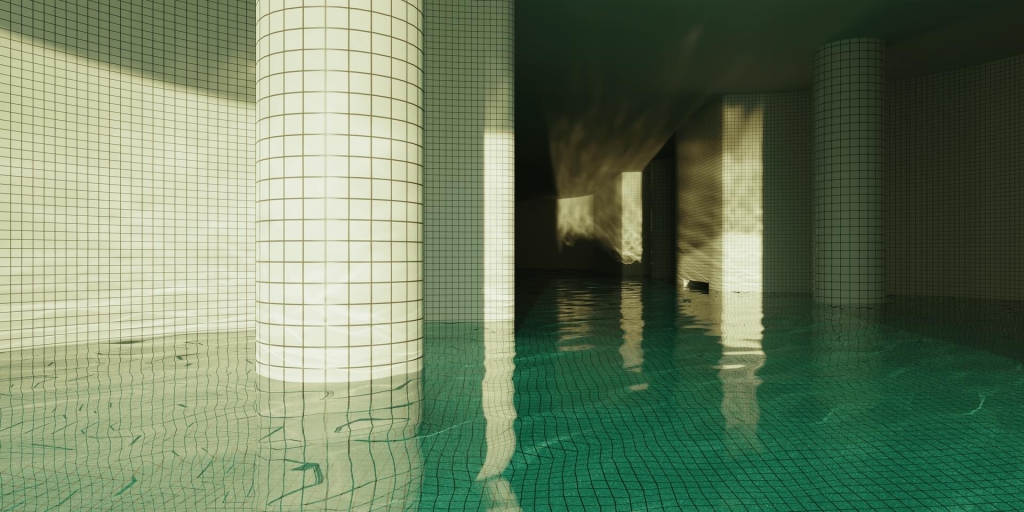 池核,是一種圍繞著游泳池這一特定場景而展開的視覺美學。它聚焦於那些空無一人、過於完美的室內外泳池,將其描繪為一種獨特的閾限空間。在池核的影像中,潔淨的磁磚線條、靜止如鏡的水面與冰冷的人造光,共同交織出寧靜、懷舊,卻又暗藏著詭異的氛圍。這個美學時常與後室傳說融合,催生出「泳池房」(The Poolrooms)的概念,也就是由無盡泳池與廊道構成的「後室」。在此,泳池的平靜不再是慰藉,反而成為一種未知恐怖的前奏,完美體現了在極致寧靜中潛藏的詭異感。(註9)