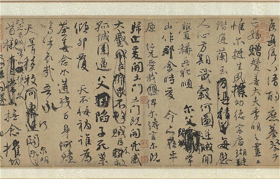 唐代顏真卿《祭姪文稿》由國立故宮博物院(簡稱故宮)收藏,被稱為「天下行書第二」,東博為了顏真卿特別展,特向台灣商借。此卷為顏真卿聽聞其堂兄杲卿與姪兒季明噩耗後所作,顏杲卿為常山郡太守,安史之亂期間未獲王承業援兵而獨守孤城,不敵叛軍攻擊最終遭擒。性格剛烈的他怒罵安祿山亂賊,身受割舌斷腿之刑,與子季明一同喪命。亂事平定,即便朝廷「嘉其死節之誠,未備飾終之禮」,追封他為太子太保,但怎能撫平顏真卿失去親人之悲?顏真卿下筆起草追祭亡姪,思緒翻騰不已,提及至親慘死始末多次反覆塗改,文末書「撫念摧切,震悼心顏」,令觀者不禁鼻酸。其筆法圓健流暢,精神一氣呵成,書寫有提按頓挫、墨色有濃黑枯灰之變化,通篇讀來令人淚潸動容。