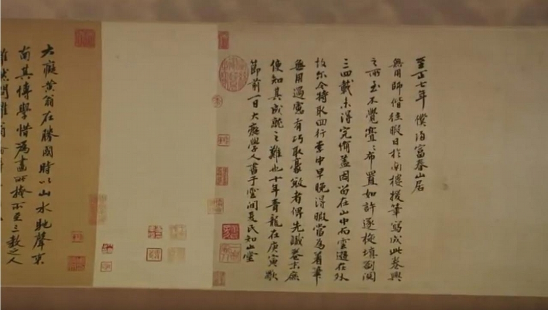 不過劇中也調侃了乾隆皇帝的「蓋章boy」身分。戲到後面演到皇帝偕已經是貴妃身分的魏瓔珞評斷兩卷《富春山居圖》孰真孰假,兩人像小夫妻一樣拌嘴。原來真假之辯,只是貴妃怕皇帝興致大發,又開始「蓋蓋樂」來毀畫,以今度古,又有幾分「穿越」感。這次美術組倒是相當警醒,兩卷畫都沒有乾隆皇帝的詩文印璽,但可能是工作人員想偷懶,或者是能力有限,劇中的兩卷《富春山居圖》,實際上都是現在被認為真跡的「無用師卷」。「無用師卷」被乾隆皇帝當成假貨,整卷畫面乾乾淨淨,劇組人員樂得輕鬆。實際上被乾隆皇帝看作真跡的「子明卷」,空白處被「蓋章boy」寫的密密麻麻,連南巡時都要帶在身邊不時題詠,最後索性大咧咧寫著「以後再也沒地方寫了」,工作人員若要後製還原,恐怕要做到哭出來。