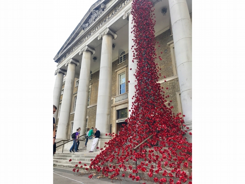 倫敦帝國戰爭博物館(Imperial War Museum)館外的裝置藝術《哭泣之窗》(The weeping window)。(攝影/詹子琦)