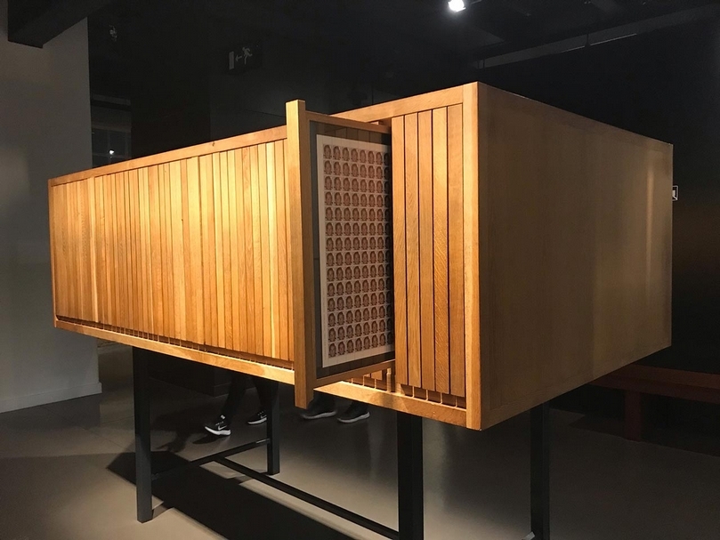 史提夫.麥昆(Steve Mcqueen)的《女王與國家》(Queen and Country)集郵櫃中印有陣亡英軍士兵的郵票細節。(攝影/詹子琦)