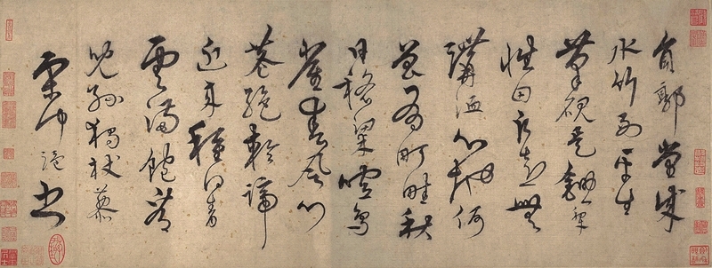 沈粲的草書,近以宋克、宋璲二人為師,遠可上溯至唐代懷素,其傳世之〈書古詩軸〉、〈草書千字文卷〉,均屬其中精品。如〈書古詩軸〉(圖7)運筆疾速、雄健爽利之處,就令人想起宋克最優秀的作品〈大草杜甫詩卷〉;而行筆迴環流轉、跌宕放逸的個性,則植基於懷素〈自敘帖〉的狂草意趣。可資留意的是,此幅草書多以大字拉長的豎畫──如「斗」、「行」、「中」等字──分割行間,再搭配筆墨由重至輕、由濃至淡的變化,讓整體書寫的節奏得以在激昂亢奮之間取得暫時的舒緩、平復,猶如一首旋律抑揚頓挫的樂曲,充分展現沈粲對於書法藝術之形式及美感的獨特見解。