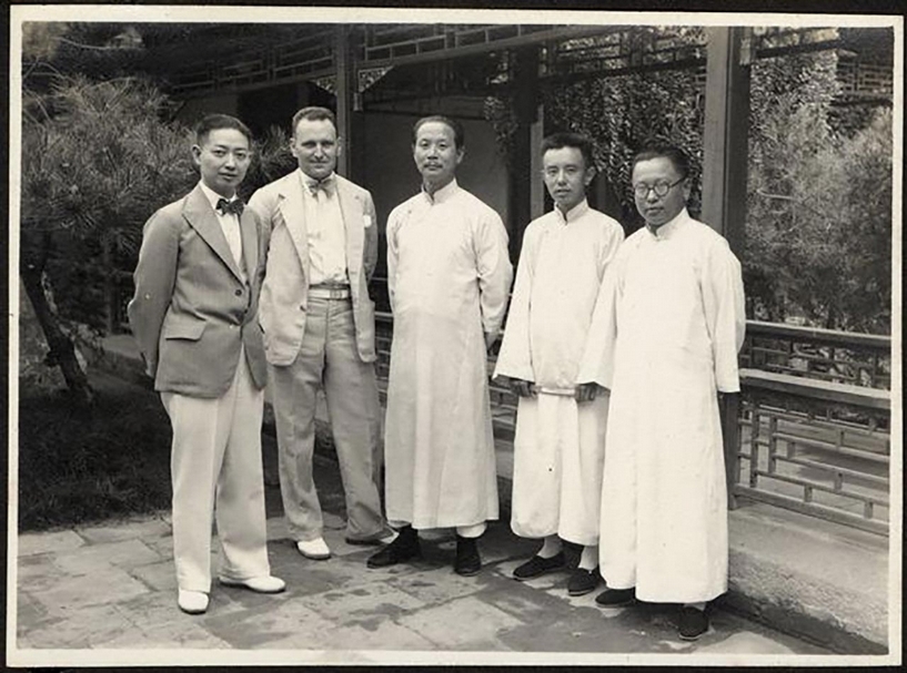 1931年8月,梅蘭芳(左起)、馬爾智、齊如山、傅芸子及傅惜華兄弟在北京合影。(維基百科提供)