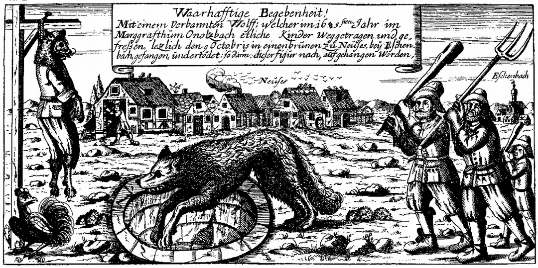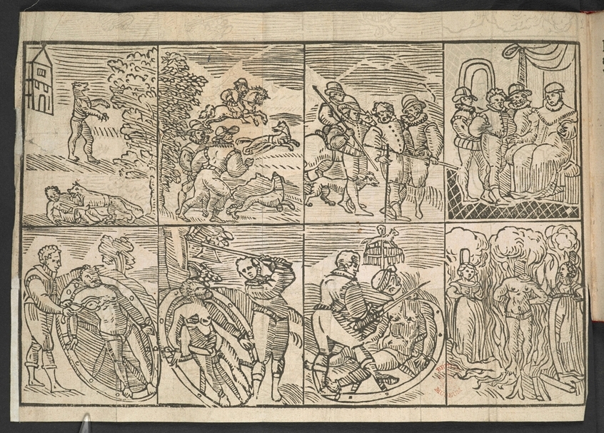 同時期傳單,描繪安斯巴赫之狼被人們獵捕、裝扮後吊掛展示的過程。圖片取自Wolfgang Schild《審判的歷史:從上帝審判到現代法學的開端》。(©Wikimedia Commons)