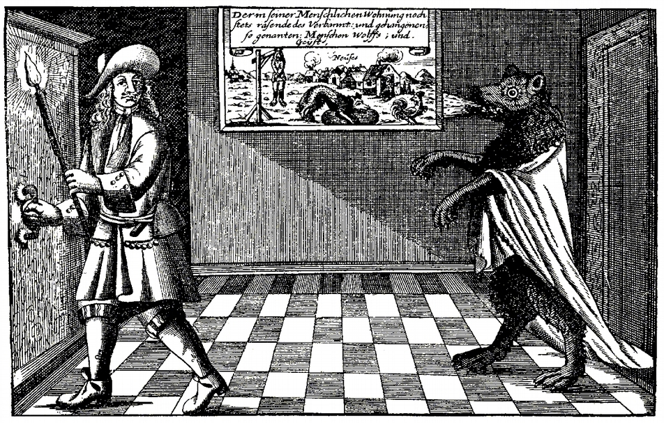 約西元1685年時的傳單,描繪死去的安斯巴赫市長變成狼人後仍在故居徘徊。圖片取自Wolfgang Schild《審判的歷史:從上帝審判到現代法學的開端》(Die Geschichte der Gerichtsbarkeit. Vom Gottesurteil bis zum Beginn der modernen Rechtsprechung, Hamburg: Nikol Verlagsgesellschaft 1997)。(©Wikimedia Commons)