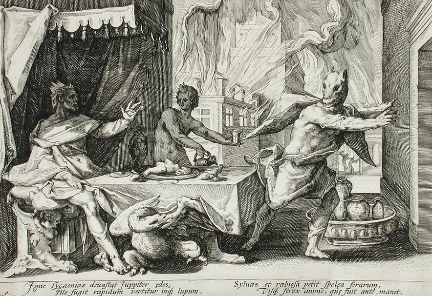荷蘭版畫家亨德里克·霍爾奇尼斯(Hendrick Goltzius)於1589年替《變形記》出版的銅版畫插圖《萊肯變身成狼》(Lycaon Transformed into a Wolf),洛杉磯郡立美術館收藏。(©LACMA)