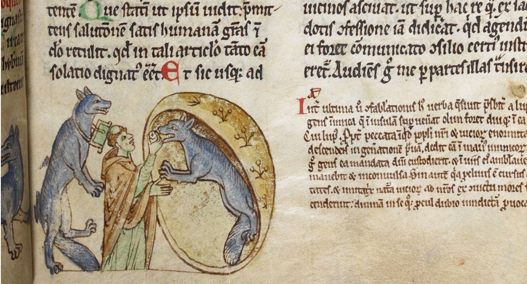 十二世紀末至十三世紀初《愛爾蘭地理志》手抄本,大英圖書館藏。現藏於大英圖書館的《愛爾蘭地理志》手抄本,在講述該傳說的書頁邊緣處,正好就繪製了神父在狼丈夫的要求下,為病妻送上臨終聖體 (viaticum)的一幕。最後,感激的狼人徹夜陪伴神父,更在天亮後將他平安送出森林,替他指出往後旅途的正確道路。(©British Library)