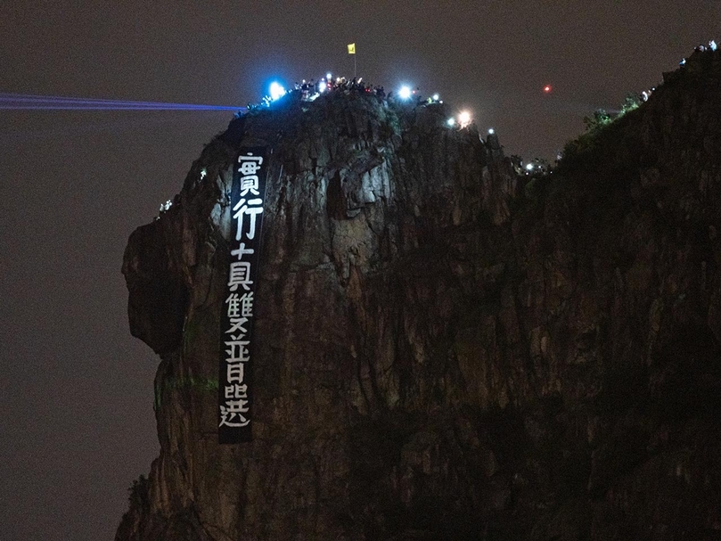 香港示威者於中秋夜在獅子山掛出「實行真雙普選」布條。(©wikimedia)