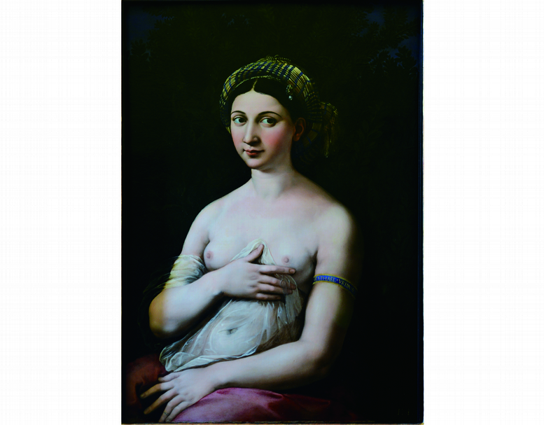 但無論如何,這對戀人都無法公開相愛。畫作中,拉斐爾為她套上作者簽名的藍底鑲金臂環,是任何人看到都無法忽視的細節。在所有細膩秀美的油彩畫作中,這個視覺彷彿陽剛甚至粗暴地宣示,這人身心永世都屬於拉斐爾。畫中女子的臉頰泛紅,溫婉地淺笑,捧著她的右乳與持著遮住腹部透明絲巾的左手,食指指向臂環,臂環套住的右手伸向置放在紅布遮住的兩腿間,真是一張高度典雅卻情慾繚繞的畫作。