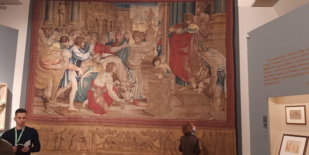 展場一景。牆上掛的是根據拉斐爾作品《在路司得傳福音(The Sacrifice of Lystra)》製作的掛毯。(閑原提供)