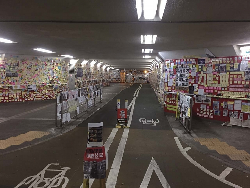 香港大埔墟站火車站出口附近的行人隧道,長達一公里多,因各通道牆身都貼滿彩色便利貼,是香港最大規模的連儂牆,更被名為「連儂隧道」。(攝影/黃宇鵬)