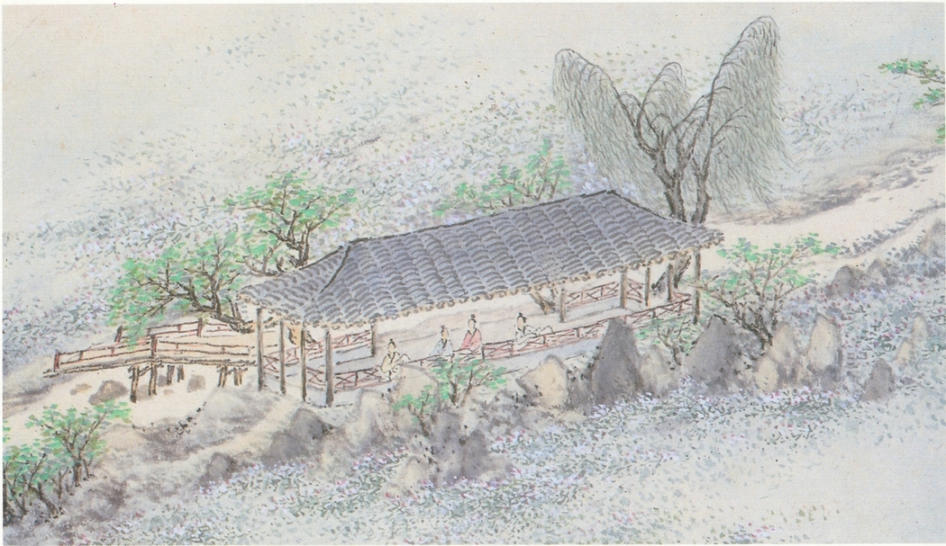 (明)沈士充,《郊園十二景圖》〈就花亭〉局部,1625,國立故宮博物院藏。(圖片來源:《園林名畫特展圖錄》,臺北:國立故宮博物院,1987,頁27。) 此圖描繪明末畫家王時敏「樂郊園」中〈就花亭〉一景,溪邊的亭內有四位雅士憑欄而坐,眺望無盡花海。