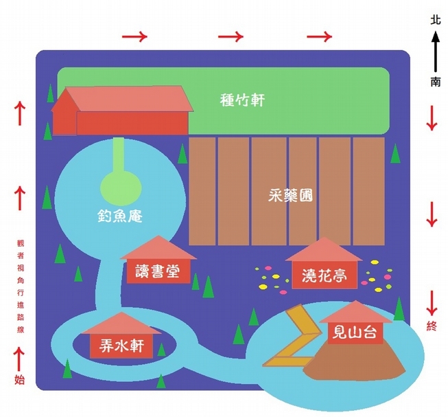 〈獨樂園記〉全文以地圖式的敘述方法指引讀者的視線,以「讀書堂」為出發點,展開對園林主要景點方位與景致的描述。在讀書堂南邊的是在「弄水軒」,讀書堂以北水塘的小島是「釣魚庵」,水塘前面是「種竹齋」,水塘東方是「采藥圃」,采藥圃後是「澆花亭」,最後是獨樂園地勢最高可以俯瞰全園的「見山亭」。職業畫家仇英創作《獨樂園圖》時,透過〈獨樂園記〉的文字描述,帶著自身的詮釋與想像,重新以視覺圖像模擬了真實的獨樂園全景。畫面上將七個景致按照敘述排出平面圖格局後,再以順時針方向的將園林景物一一呈現在畫卷中。