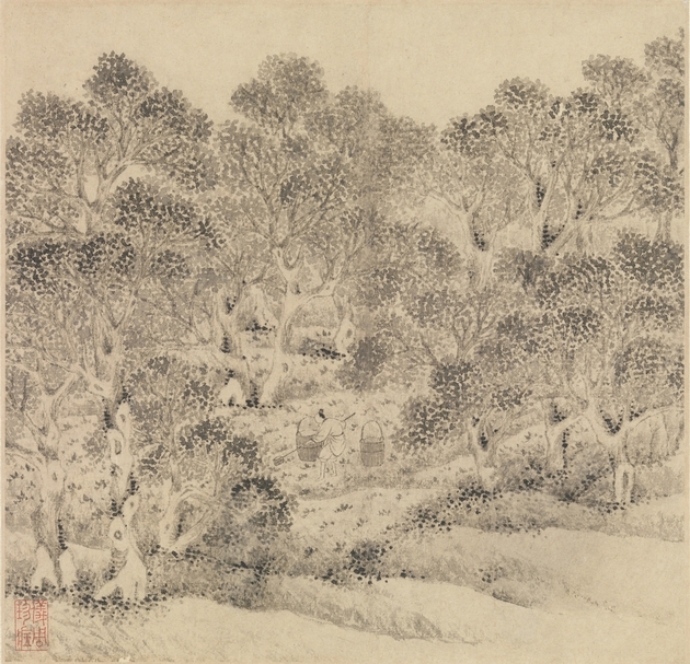 (明)文徵明,《拙政園圖詠》局部,1551,紐約大都會博物館藏。畫面描繪園主在拙政園「來禽囿」澆灌林禽(蘋果)的莊稼活動。嘉靖十三年(1535)文徵明曾應園主王獻臣的請求,將園內三31處景點繪製成《拙政園三十一景圖》,並為每幅圖賦詩一首。1551年,文徵明從《拙政園三十一景圖》中選擇其中12景重繪成《拙政園圖詠》冊頁,今日僅存8景圖,現藏美國大都會博物館。(© The Metropolitan Museum of Art)