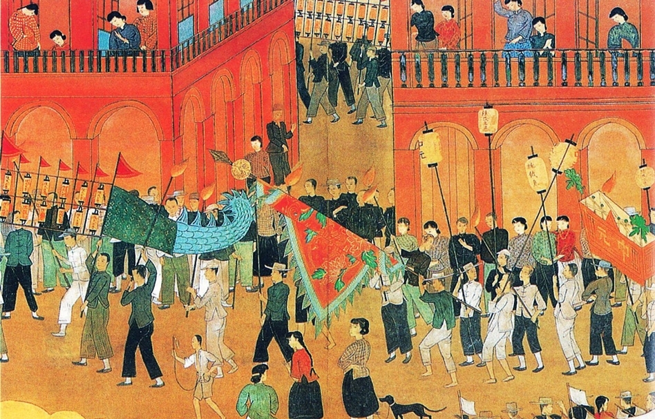 除了著名的《南街殷賑》外,1927年第一回臺展即有村上無羅所繪製的《基隆燃放水燈圖》,內容就是基隆著名的傳統中元祭典。民眾在夜裡舉著以燈籠串接起來的龍形巨陣,觀看的人潮圍聚在道路兩岸與樓閣窗邊,彷彿可以感受到夜裡喧騰的聲音。畫面右下方舉著「中元」的牌子,清楚點出畫作描寫的時間。恰巧1928年的《臺灣日日新報》即曾報導基隆中元節祭祀的情形:「既報基隆慶安宮,盂蘭盆會,如所豫定,去八日夜燃放河燈,是日由地方而來者,有數萬人之多,…市中頓形熱鬧。午後五時半頃煙火三發,各姓及各團河燈,齊集當廟前,由督隊者指揮,自第一番至三十六番,順序出發,繞行全市。…沿途變成白晝,…兩邊圍觀之人,交通為之杜絕。…各團多為龍燈。就中芭蕉仲買團所裝藝閣,閣上滿飾花燈,燃以瓦斯火,燦爛奪目。…公園廣場,殆被塞滿,其人數不下三萬。」與村上無羅的作品對照,更能理解畫面中的細節,成為舊日報導的最佳配圖。