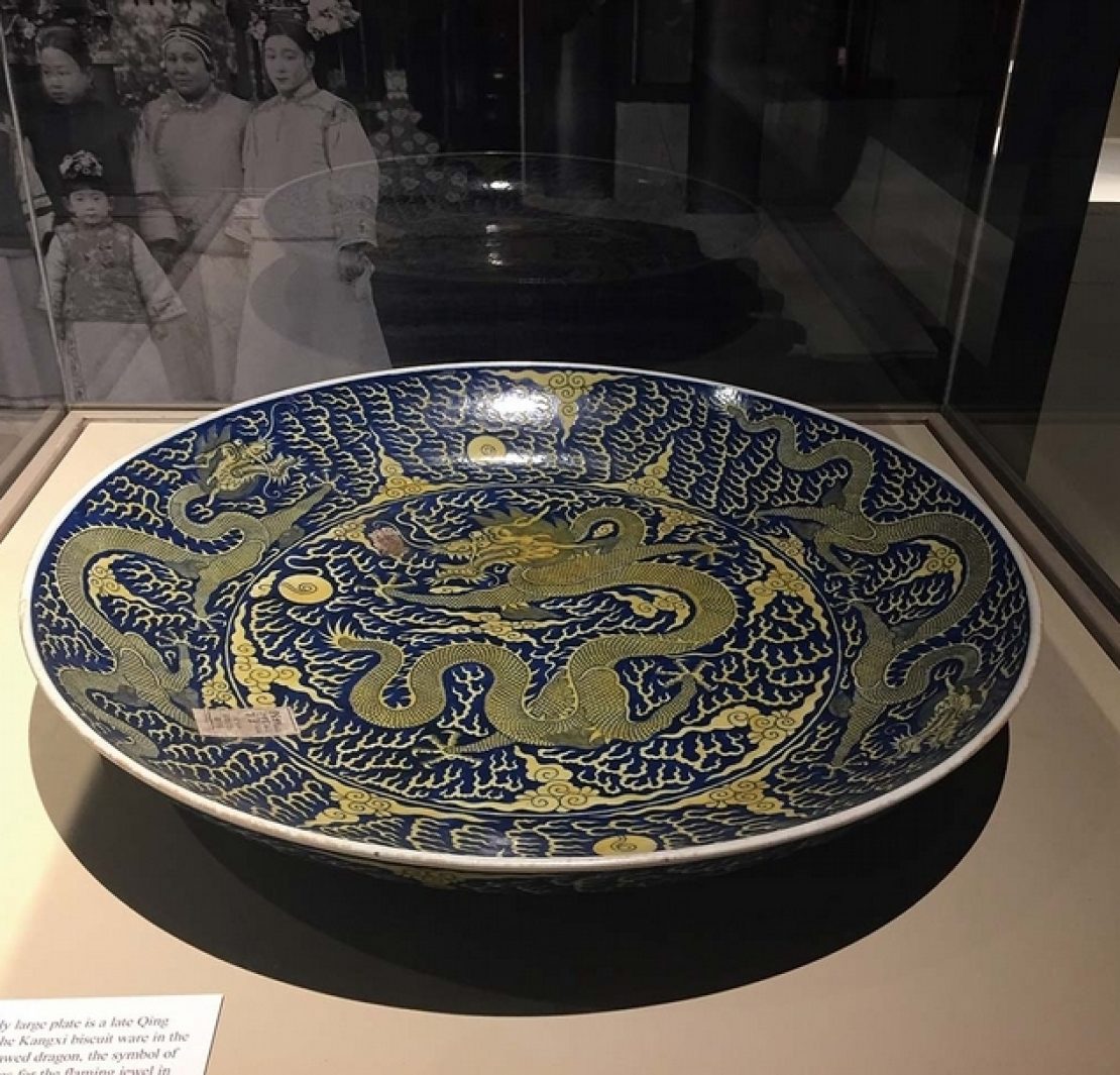 圖9 清光緒〈藍地黃龍紋大盤〉,「儲秀宮製」款,直徑70公分,北京頤和園公園管理處藏。圖/彭盈真。