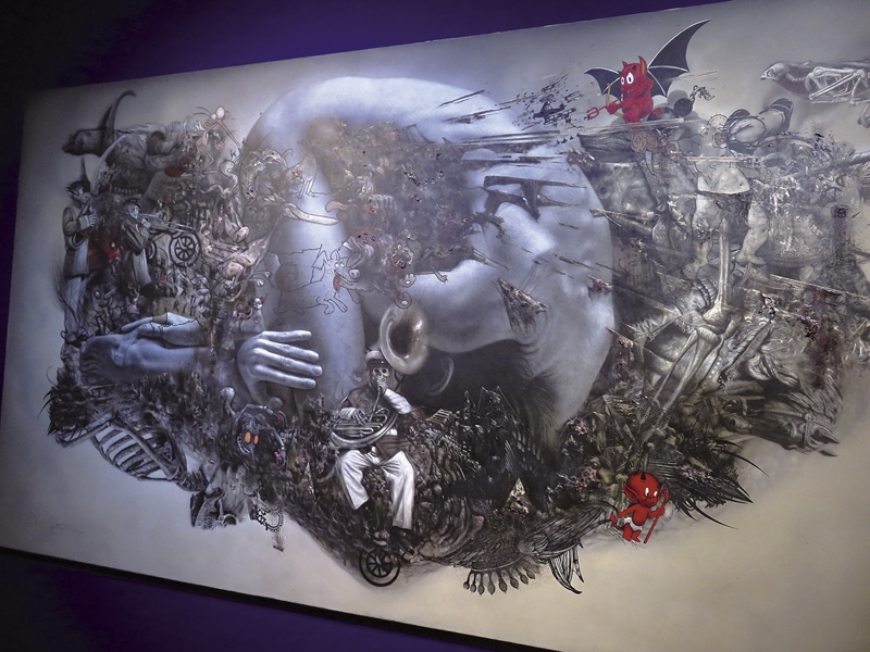 沿著撲天蓋地的黑色隧道,走到展場的最後展間,《殘破家園》( Tira-tirahan),作品尺寸214×489公分,是此展最大尺幅之作。畫面講述著鄉土家園的災難意象。作品標題「 Tira-tirahan」 在菲律賓語代表雜碎廚餘的意思;對一般小老百姓而言,當家園面臨無法避免的自然災害時,最需要的就是安頓好一切,盡快恢復秩序。然而,我們最常見的卻是自然災害現場經常淪為政客們的表演舞台。羅納德在畫面中特別以卡漫式的造形畫出狗撕裂烤肉的形象,隱喻政治人物抵達災難現場習慣施予小惠以提升自身知名度,但卻對救災毫無助益。羅納德以黑白色調描繪自然災害所帶來的混亂與衝擊,與菲律賓所處的現況相呼應,不論是自然或人為,對小老百姓而言都猶如颱風、地震、海嘯般的巨大;內心寄望重建,卻又淪為政客虛張聲勢的踏腳石。