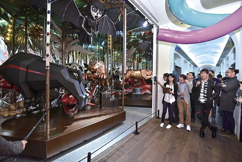 開幕當天藝術家特別為我們現場示範,這座旋轉木馬幾乎是擬真的狀態;羅納德毫無顧忌,一股腦兒地直接跳上旋轉木馬,旋轉木馬啟動,展場的霓虹燈光閃爍,音樂聲響起,讓我們感受到這場魔幻的藝術饗宴,已然開始了。