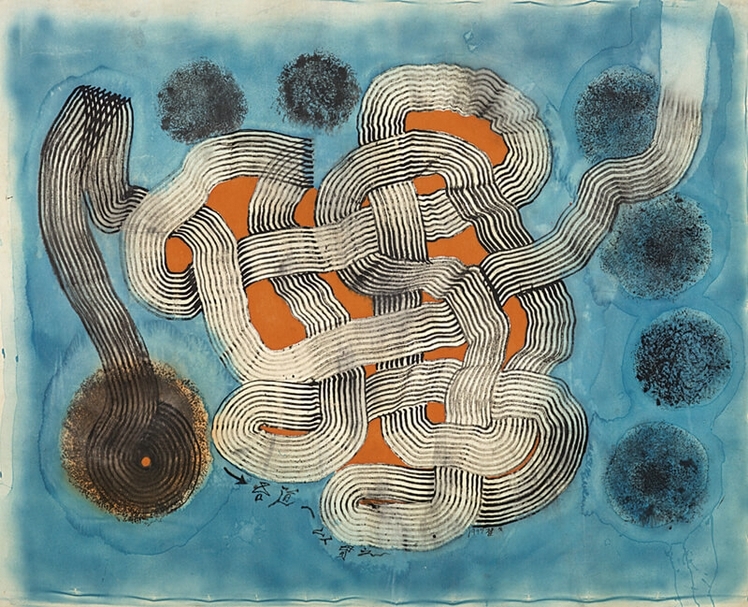 楚戈,吾道一以貫之,壓克力顏料、水墨、布,144x187cm,1997,尊彩藝術中心提供。