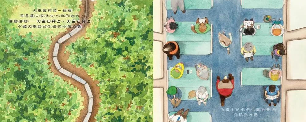 故事裡的圖象畫面,帶著我們從不同視角,經歷火車裡外的各種風景,而勇氣,也就在這樣的互相陪伴過程裡,一點一滴地滋養和發展。
