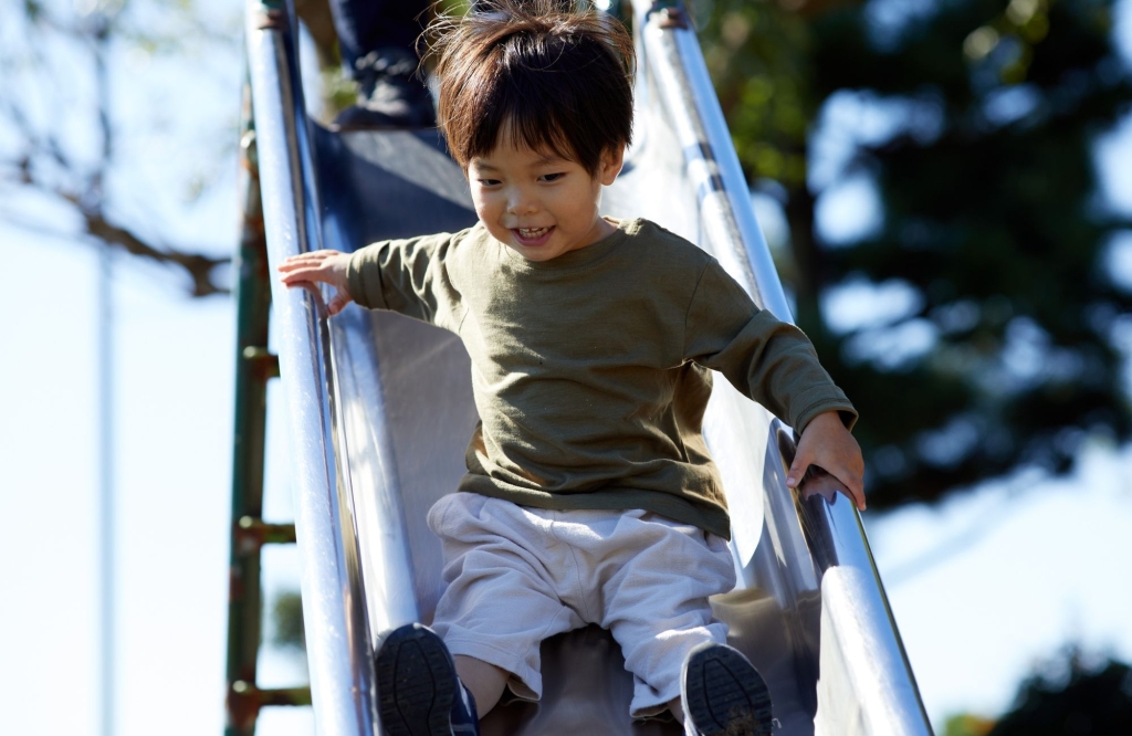 「我怕…跌下去會撞到地上的石頭」小男孩說。「喔,我懂你的意思了,這的確有可能…還是,我們來想想看,有什麼方式你可以比較放心地滑呢?如果像這樣呢?」爸爸邊說邊坐到溜滑梯起頭處,示範著身體往後倒一些,滑了下來。