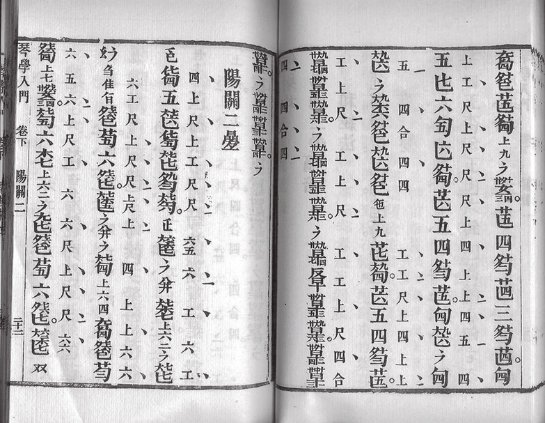 鄭德宣提出,古琴減字譜的出現與翻譯外族語言有關。圖為《琴學入門》減字譜旁註工尺譜。圖╱維基百科。